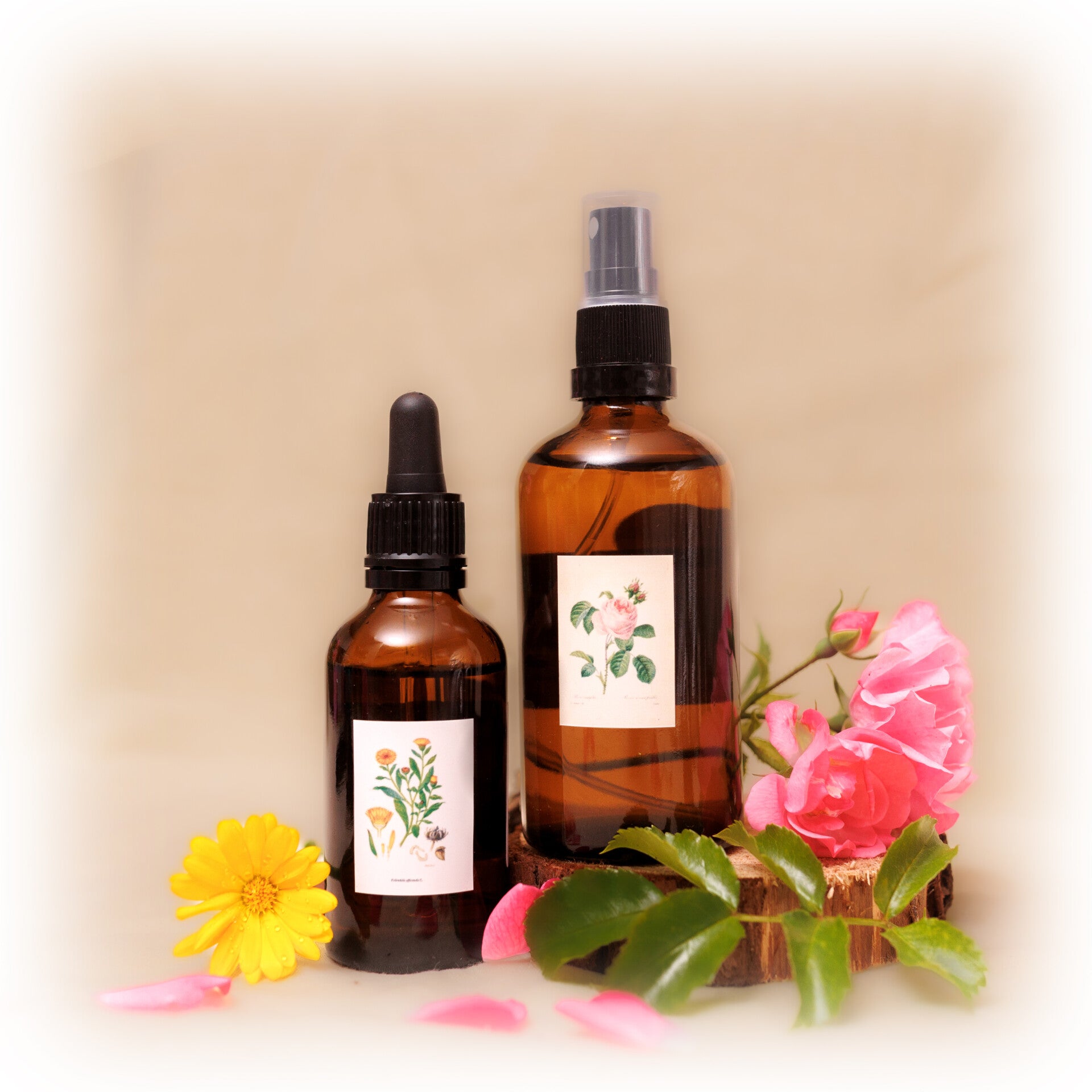 Set gezichtsverzorging: Rozenspray & Goudsbloemolie - Deze set bestaande uit rozenspray en goudsbloemolie is een gouden duo voor de huid! De verzachtende goudsbloemolie is helend voor de huid en geschikt voor de (zeer) gevoelige huid. De rozenspray kalmeert, verzacht en hydrateert de huid en heeft een heerlijke geur die rustgevend werkt. Deze combi verminderd fijne lijntjes en littekens en verbetert je teint. je begint met de rozenpray op een gereinigde huid en brengt daarna een paar druppeltjes olie aan en klaar voor een stralende dag (of nacht). Alle producten zijn met biologisch geteelde kruiden en biologische ingrediënten, zuiver en puur natuur!