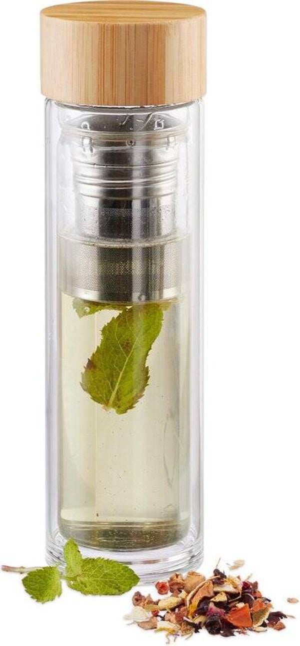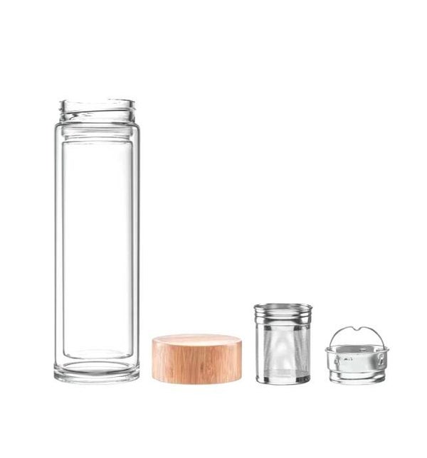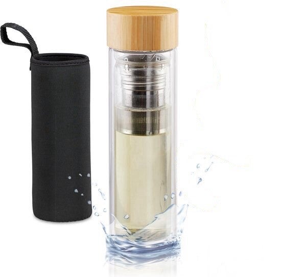 Glazen theefles met infuser, dubbelwandig - Dubbelwandige glazen drinkfles (500 ml) van borosilicaatglas met dop van bamboe, rvs compartiment voor thee en handige beschermhoes met handvat.